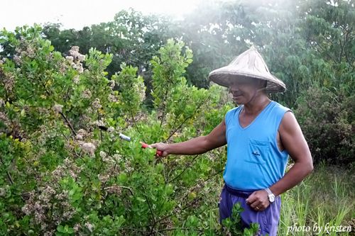 池子裡長滿了野生菱角,現在正是果實成熟季節,幸運的讓我們巧遇了來此採菱的村民。成熟的菱角會因負重不了而沈入水底,所以在翻開一株株的菱葉時,動作必須輕柔,以免把可採集的菱角給不小心弄落至水裡。他坐在橡皮圈上一邊仔細的在水塘裡翻找,一邊和我們聊著天,教我們一點有關菱角的知識。要不是,橡皮圈只有一個,且上下水塘不方便,不然我還真想下水去幫忙呢!